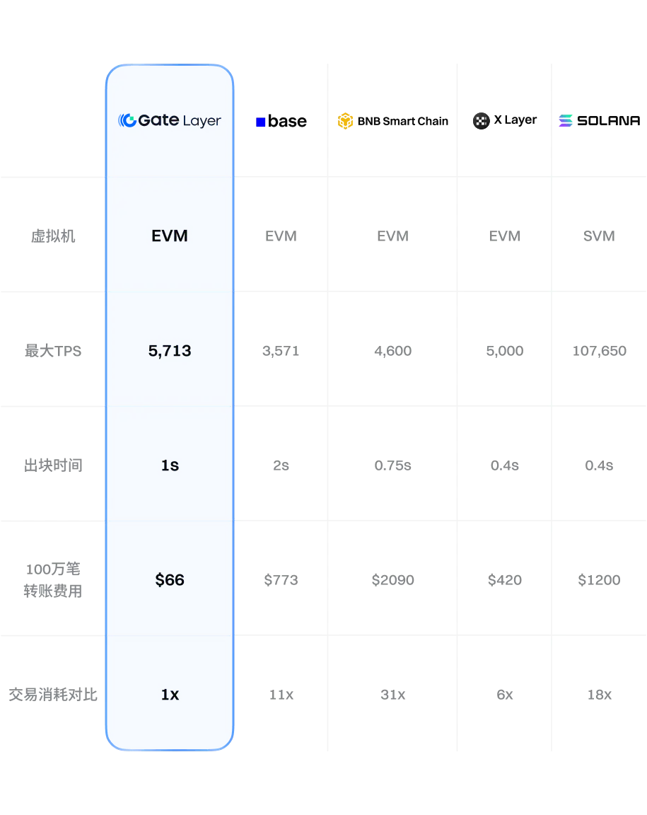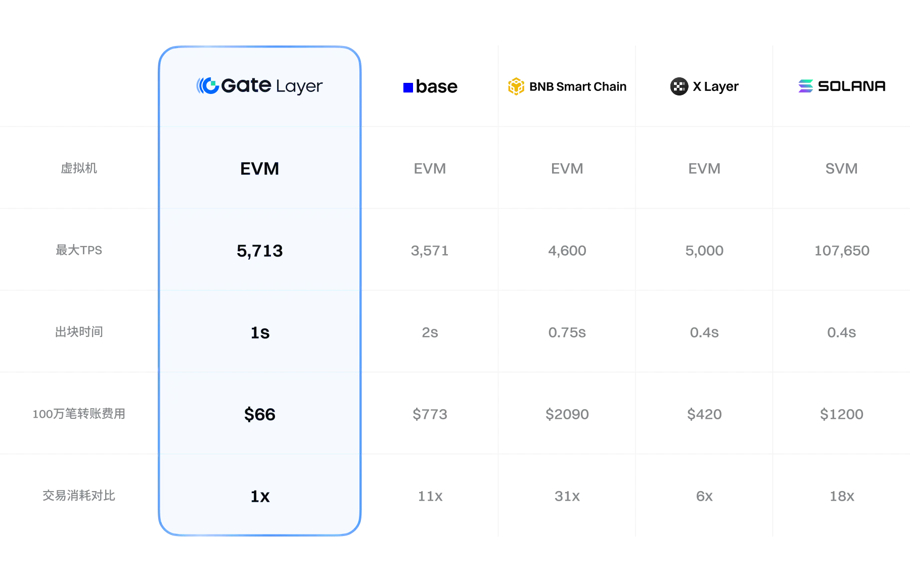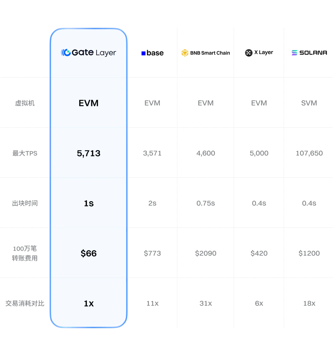 以原生转账为例,每笔转账大约消耗 21k Gas,而 Gate Layer 的单个区块 Gas 上限为 1.2 亿。也就是说,每个区块可处理约 5,714 笔交易,换算为 TPS 超过 5,700。