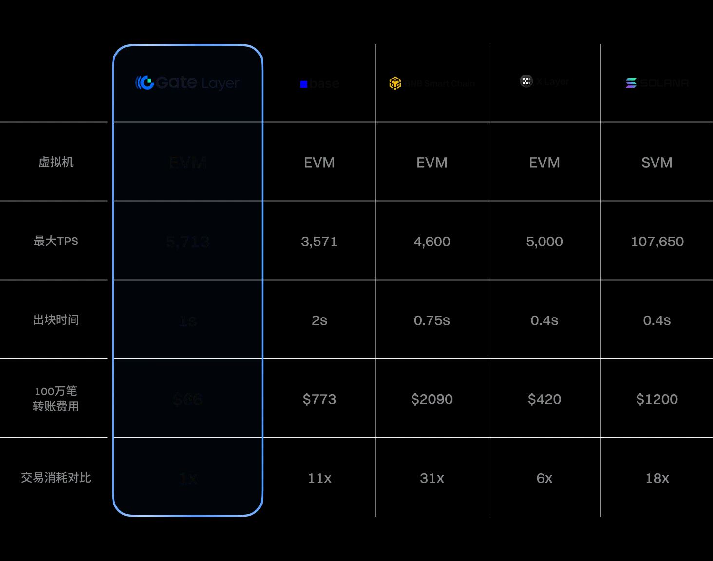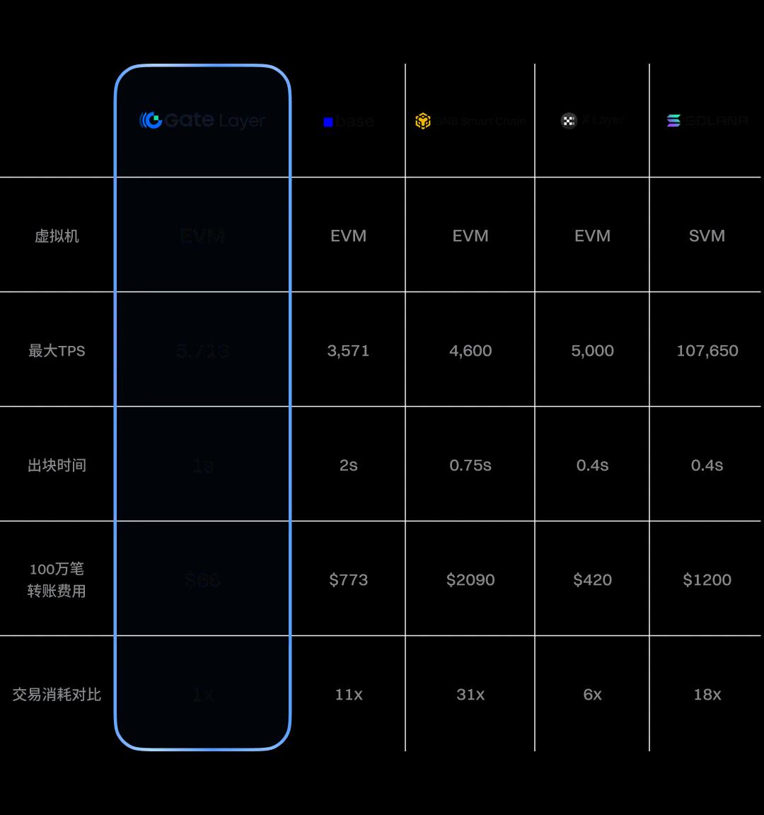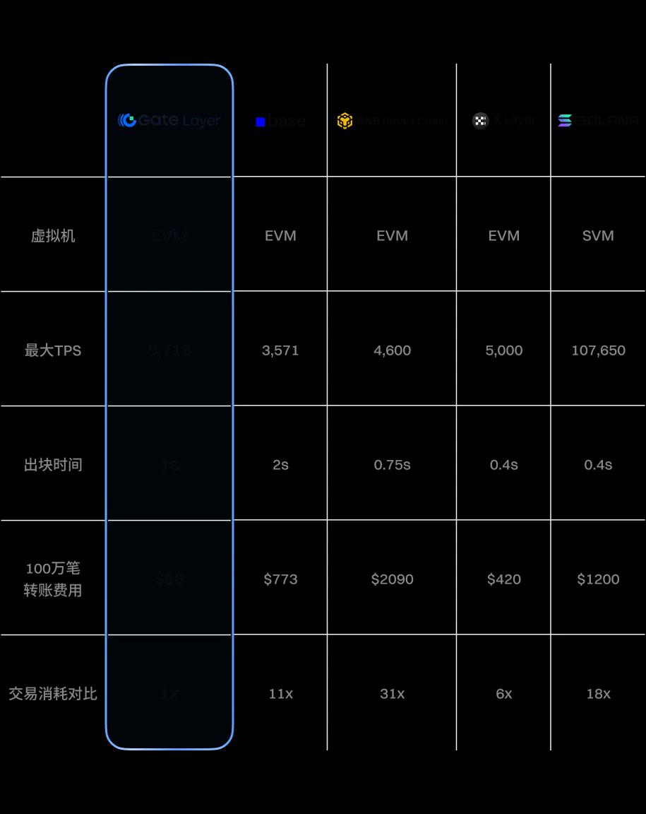 以原生转账为例,每笔转账大约消耗 21k Gas,而 Gate Layer 的单个区块 Gas 上限为 1.2 亿。也就是说,每个区块可处理约 5,714 笔交易,换算为 TPS 超过 5,700。